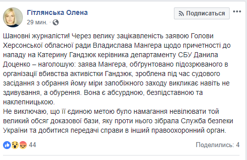 «Шановні журналісти! Через велику зацікавленість заявою Голови Херсонської обласної ради Владислава Мангера щодо причетності до нападу на Катерину Гандзюк керівника департаменту СБУ Данила Доценко – наголошую: заява Мангера, обґрунтовано підозрюваного в організації вбивства активістки Гандзюк, зроблена під час судового засідання з обрання йому міри запобіжного заходу викликає навіть не здивування, а обурення. Вона є абсурдною, безпідставною та наклепницькою», – пише Гітлянська у Facebook.