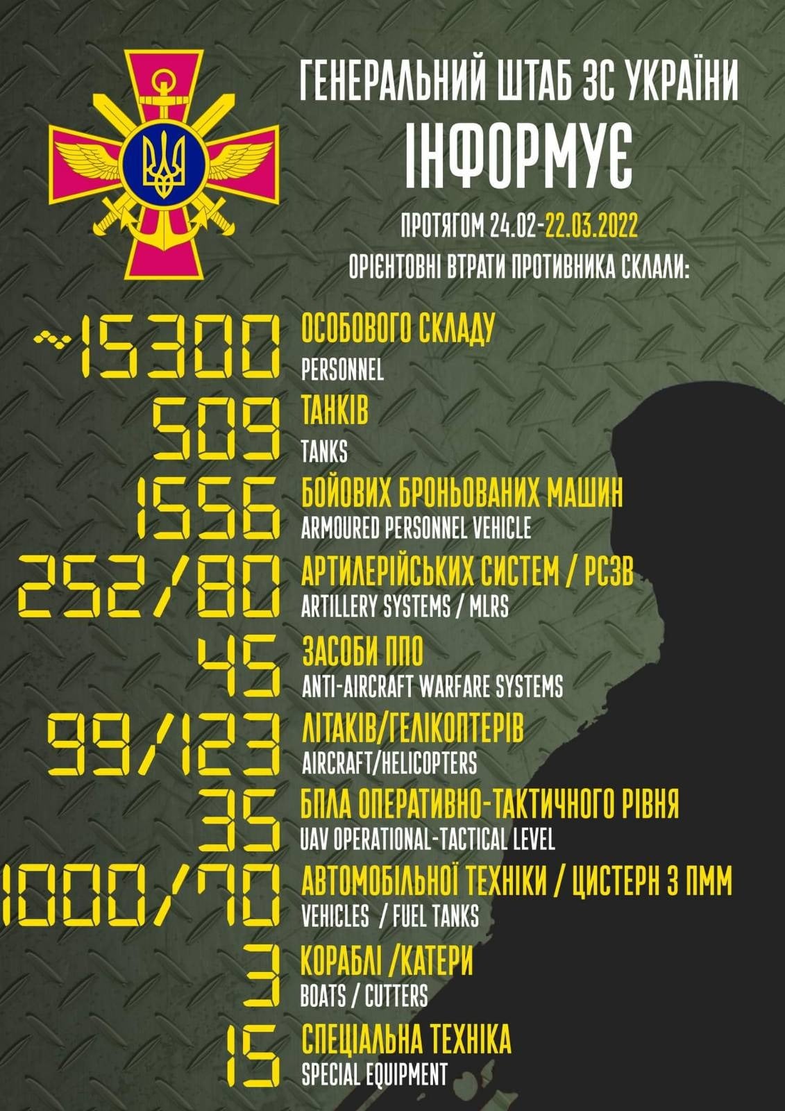 Так, загальні бойові втрати противника у період з 24.02 по 22.03 орієнтовно склали: