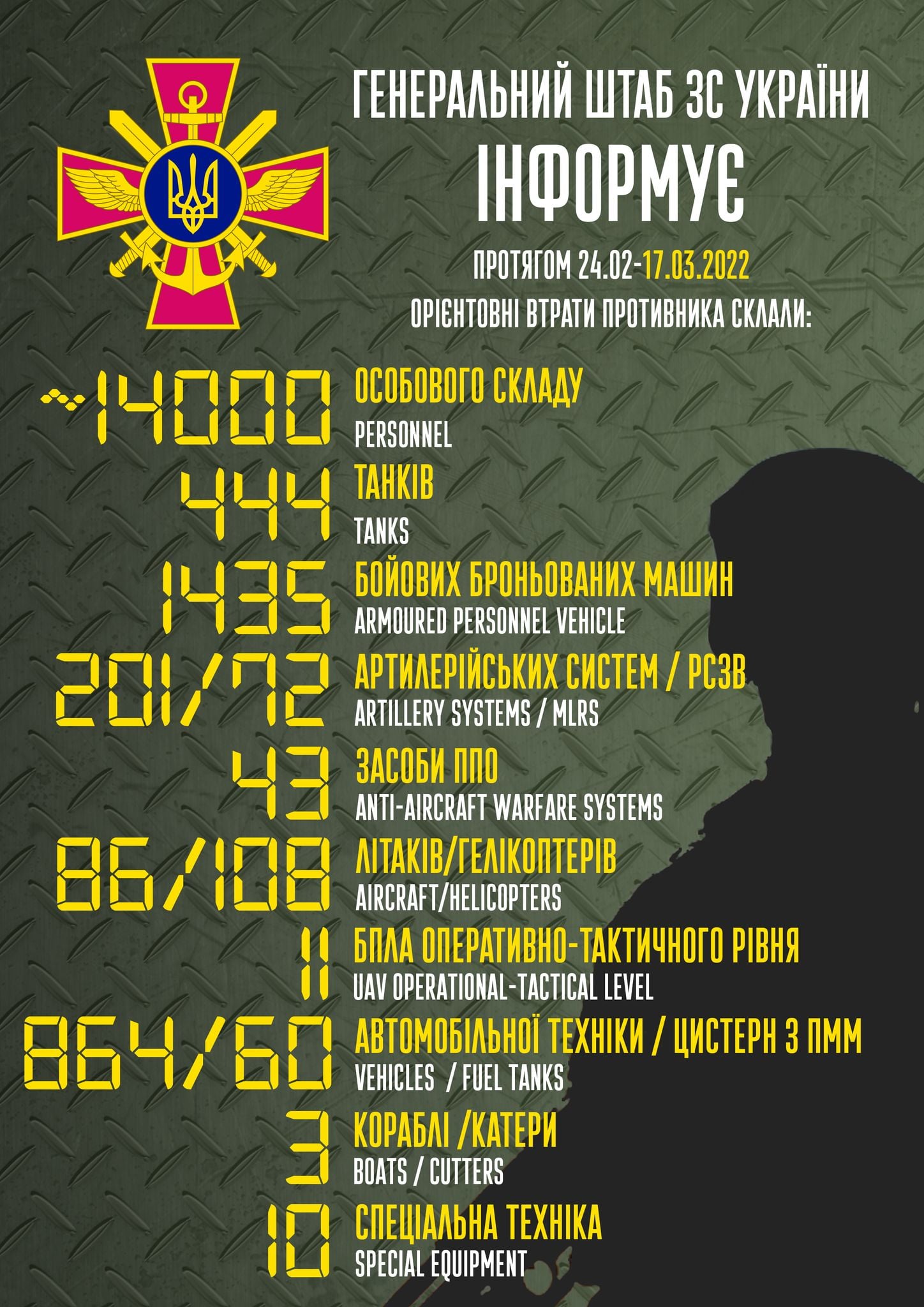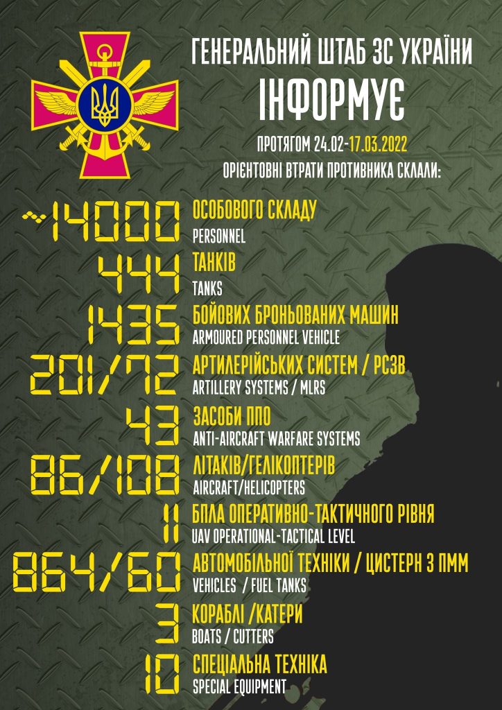 Так, загальні бойові втрати противника з 24.02 по 17.03 орієнтовно склали: