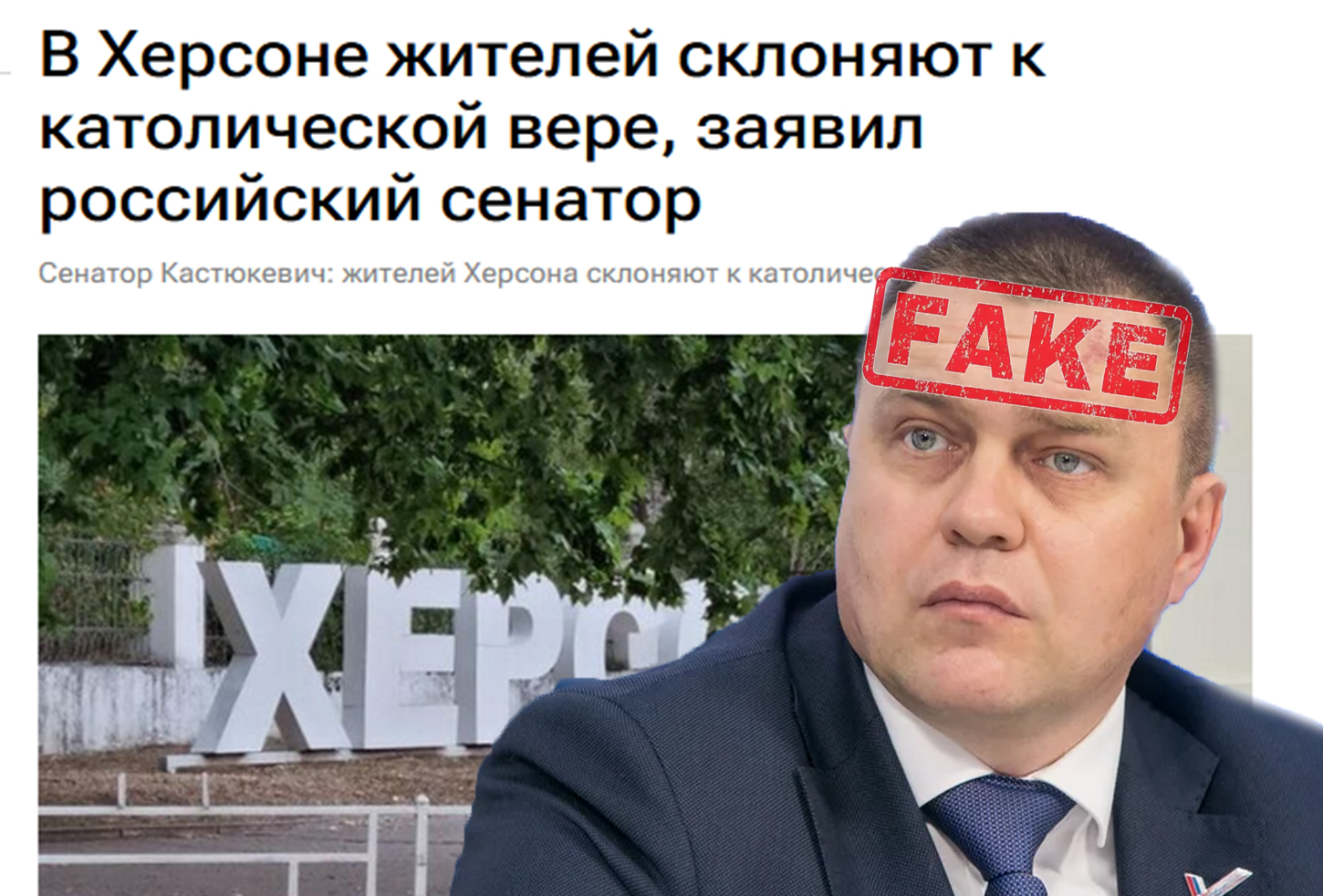 “В окупованому російському місті Херсоні людей схиляють до католицької віри. Отримав звістку від жителів. Розповідають, що у Херсоні почали активно відкривати католицькі церкви. А парафіян залучають через гуманітарну допомогу. Одночасно з тим, що в місті місцева влада практично не видає продукти та ліки, змушуючи старих людей жити надголодь, у католицьких церквах обіцяють все це в достатку та безплатно”, – зазначає відомий російський брехун, так званий “сенатор” від Херсонщини Ігор Кастюкевич.