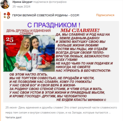 Ці повідомлення вже видалені зі сторінки Ірини Шкурат, проте на ній можна знайти ще багато подібних постів.