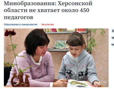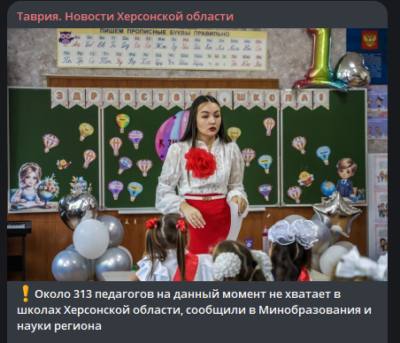 “Близько 313 педагогів наразі не вистачає у школах Херсонської області, повідомили у Міносвіти та науки регіону.Особливо гостро брак відчувається у прифронтових районах. Найбільше потрібні вчителі початкових класів, російської мови та літератури, іноземних мов та математики”, – повідомляють окупанти.