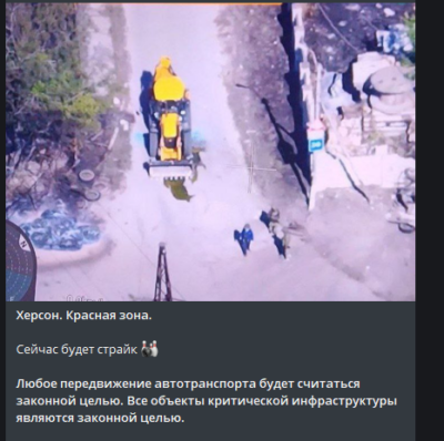 А це свіжий скриншот публікацій з іще одного російського Telegram-каналу за 29 вересня 2025 року. З цієї помийки відверто заявляють, що кожну людину в Херсоні окупанти вважають військовим та намагаються знищити, навіть якщо, як в цьому випадку, “вони чудово бачать, що працюють комунальники”.