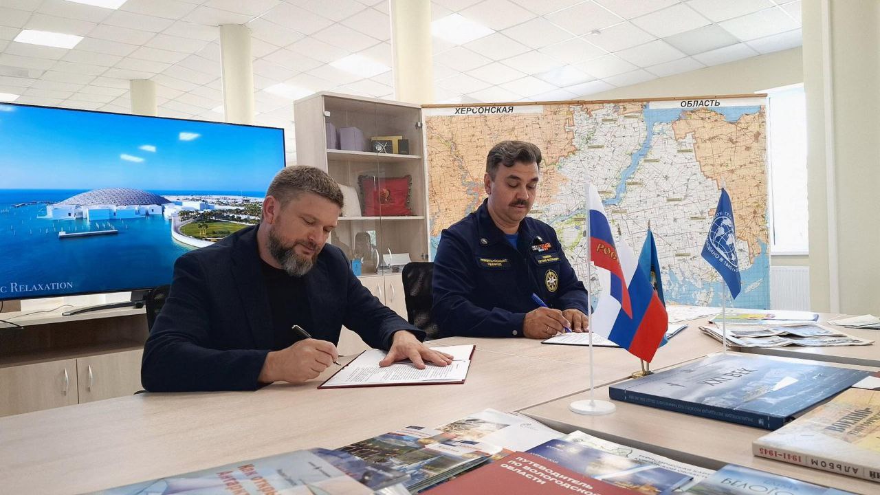 Колаборант Сєргєй Запускалов (ліворуч). Фото: окупаційні ЗМІ