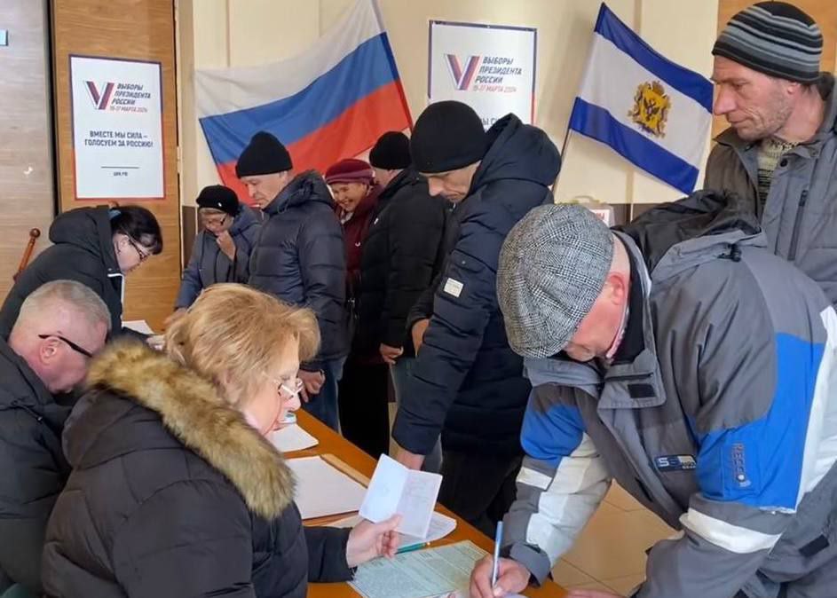 Голосування на незаконних виборах на лівобережжі Херсонщини навесні 2024 року. Фото: російські джерела.