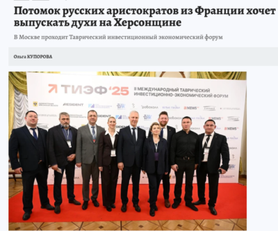 Цікаво, чи «нащадку російських аристократів» відомо, що Франція не визнає лівобережжя Херсонщини частиною Росії й будь-яка його бізнесова діяльність на окупованій частині регіону може вважатися незаконною? До того ж так званий «губернатор» Херсонщини Володимир Сальдо відкрито називав всіх французів «жабоїдами» та обіцяв їх вбивати. Чи ці фактори ніяк не вплинуть на рішення «нащадка аристократів» відкрити в регіоні підприємство?