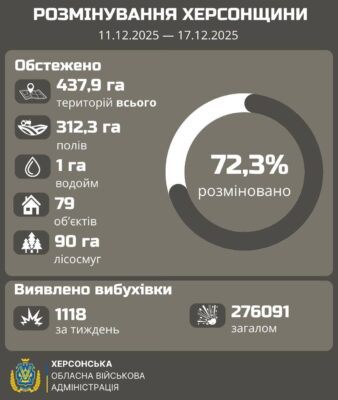 В Херсонській області триває процес розмінування. Спеціалісти-піротехніки тільки впродовж минулого тижня виявили та знешкодили 1118 вибухонебезпечних предметів. Загалом в регіоні станом на зараз виявлено та знешкоджено 276091 вибухонебезпечний предмет.