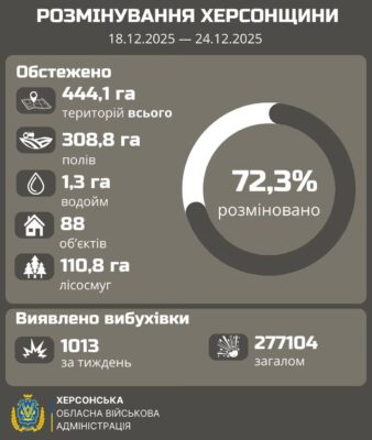 В Херсонській області триває процес розмінування. Спеціалісти-піротехніки тільки впродовж минулого тижня виявили та знешкодили 1013 вибухонебезпечних предметів. Загалом в регіоні станом на зараз виявлено та знешкоджено 277104 вибухонебезпечний предмет.