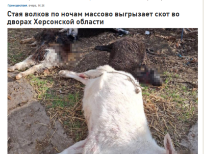 «Наслідки чергового нічного рейду хижаків в одне з господарств шокують. Вранці власники виявили на обійсті справжню бійню: сім кіз із перегризеними горлами та роздерті кролики. Жителі ще одного будинку побачили перебитого птаха у своєму дворі. Судячи зі слідів та розповідей очевидців, у зграї як мінімум три великі особини. Діють вони швидко, тихо і вкрай жорстоко — більшість тварин убито, але не з’їдено», – переповідають російські медіа про наслідки чергового «рейду» вовків в окупованому Генічеському районі.