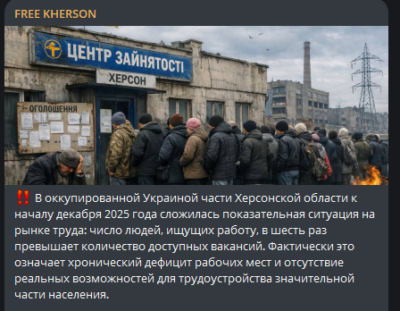 «В окупованій Україною частині Херсонської області на початок грудня 2025 року склалася показова ситуація на ринку праці: кількість людей, які шукають роботу, у шість разів перевищує кількість доступних вакансій. Фактично це означає хронічний дефіцит робочих місць та відсутність реальних можливостей для працевлаштування значної частини населення», – зазначають росіяни.