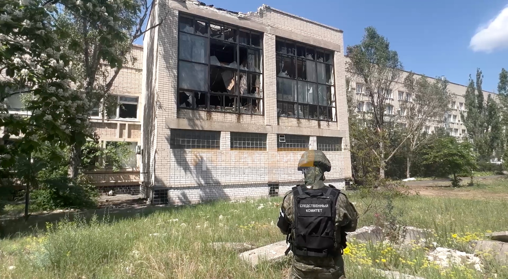Представник окупаційної влади біля лікарні Нової Каховки, літо 2023 року. Фото: скріншот відео
