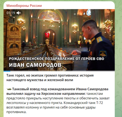 «Танковий взвод під командуванням Івана Самородова виконував завдання на Херсонському напрямку: танкістам потрібно було прикрити наступ піхоти та забезпечити захоплення лісосмуги у населеного пункту. Під час прориву екіпаж зіткнувся з масованою атакою ворожих дронів. Машина спалахнула, але танкісти продовжували бій, гасячи вогонь прямо на ходу. У цьому зіткненні екіпаж Самородова зумів знищити дві БМП “Bradley”», – повідомляють росіяни.
