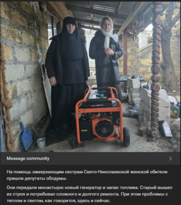 «У жіночій обителі холод панує з тієї ж причини – через відключення та низьку напругу. Матінка Калісфенія попросила у влади вугілля, щоб залучити старе, але надійніше джерело тепла – пічки. На допомогу сестрам Свято-Миколаївської жіночої обителі, що замерзають, прийшли депутати облдуми. Вони передали монастирю новий генератор та запас палива», – зазначають російські видання.