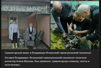 «Гуманітарний візит до Володимиро-Іллінського геріатричного пансіонату. Сьогодні Володимиро-Іллінський геріатричний пансіонат відвідала волонтер Олена Москва. Вона привезла гуманітарну допомогу: стрічки та сітки-основи. Наші підопічні — справжні трудівники, які вже третій рік допомагають нашим воїнам! Тепер у нас є все необхідне, щоб продовжити плести маскувальні сітки. Робота не зупиняється ні на день», – зазначають місцеві колаборанти.