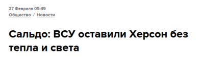«Губернатор Володимир Сальдо розповів про важку ситуацію в Херсоні, де через дії ЗСУ у жителів немає стабільного опалення, води та електрики, а головною проблемою став страх перед мобілізацією. Він охарактеризував ситуацію в Херсоні, контрольованому українськими збройними формуваннями, як напружену та виснажливу для населення. Основною причиною цього він назвав перебої у роботі комунальних систем», » зазначають російські медіа.