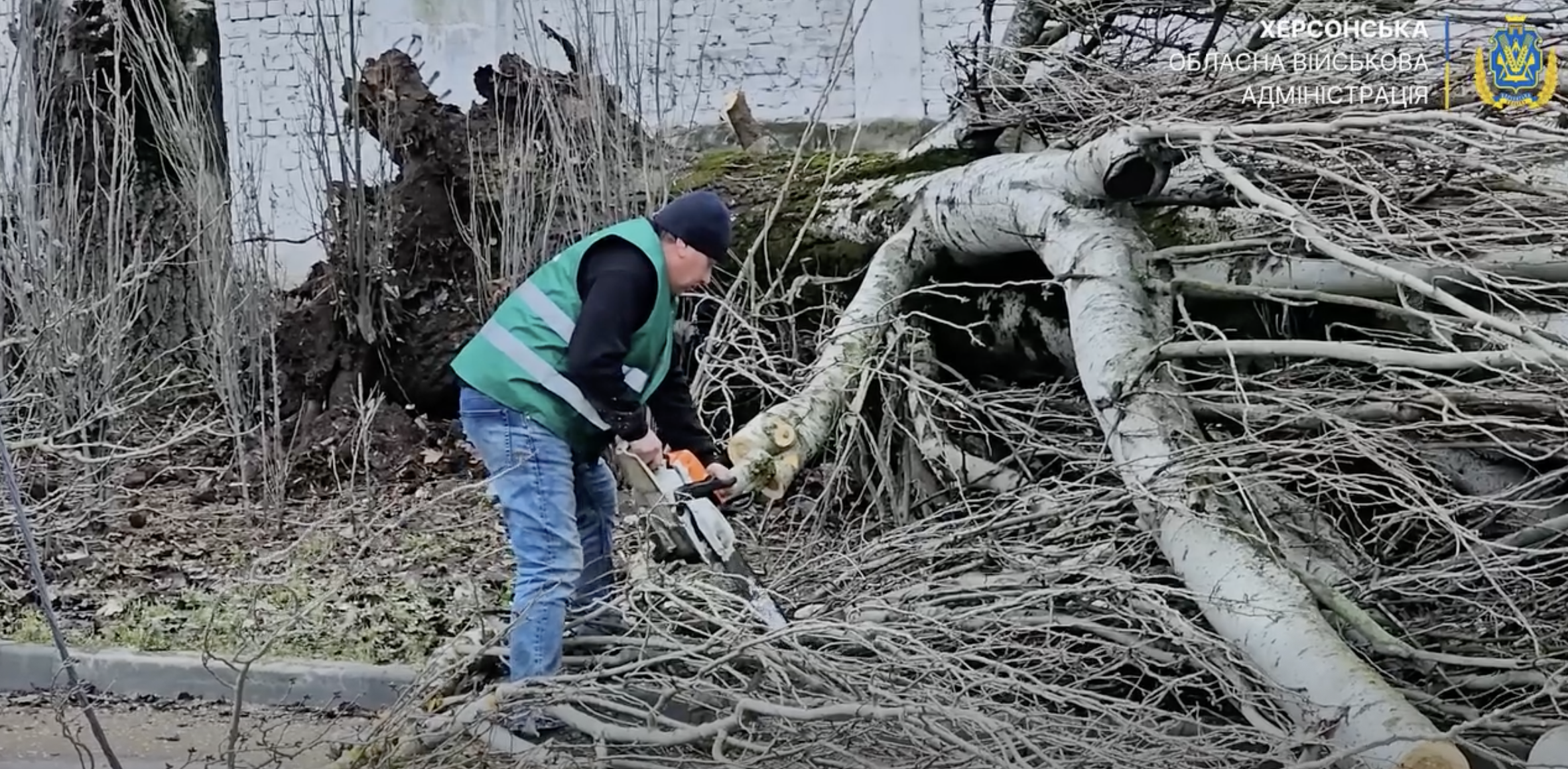 Працівники комунальних підприємств у Херсоні продовжують роботу над ліквідацією наслідків негоди, адже через зливу та сильний вітер у місті повалило дерева, які заблокували рух проїжджими частинами.