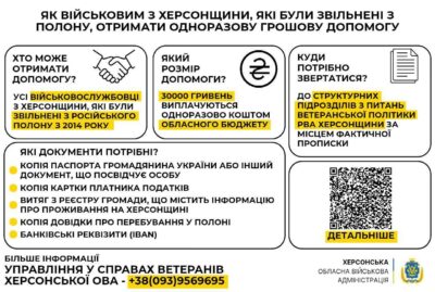 З усіма питаннями можна звернутись до Управління у справах ветеранів Херсонської ОВА за номером: +380 93 956 96 95.