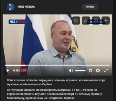 «З початку спеціальної військової операції Драган проживав у регіоні на підставі посвідки на проживання. Після закінчення необхідного терміну у лютому поточного року він звернувся до міграційного підрозділу херсонської поліції із заявою про прийом до громадянства Російської Федерації. Поліцейські надали консультативну допомогу, ухвалили позитивне рішення та в найкоротші терміни оформили необхідні документи», – зазначають росіяни.