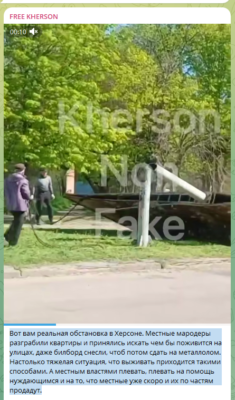 «Ось вам реальна ситуація в Херсоні. Місцеві мародери пограбували квартири й почали шукати, чим би поживитись на вулицях, навіть білборд знесли, щоби потім здати на брухт. Настільки важка ситуація, що виживати доводиться такими способами. А місцевій владі начхати на допомогу нужденним і на те, що місцеві вже скоро і їх продадуть по частинах», – зазначають росіяни.